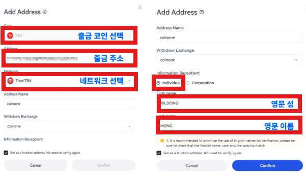 2.Individual을 선택해주시고 여권에 기재된 영문 이름과 동일하게 Last name(성)과 First name(이름)을 입력한 뒤 Confirm을 눌러주세요.