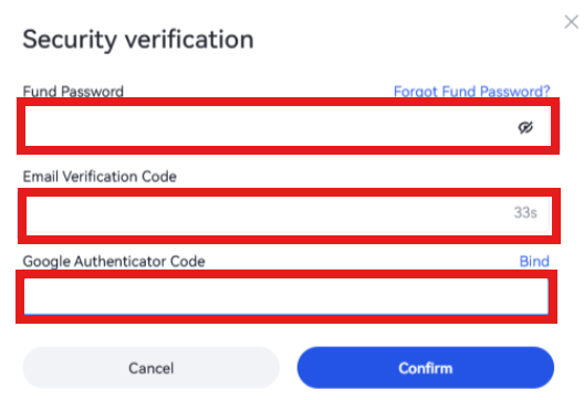 Fund Password와 가입하신 이메일/전화번호로 전송된 인증코드를 입력하신후 구글 OTP 코드를 입력해준뒤 Confirm 버튼을 클릭해주시면 주소 등록이 완료됩니다.