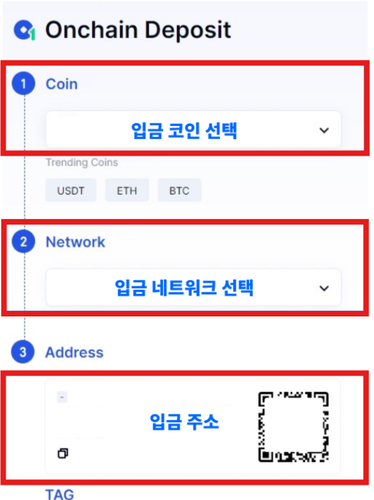 앱에 접속한 후 Deposit 버튼을 클릭하고, Onchain Deposit 메뉴를 선택하면 됩니다.