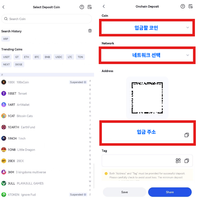 입금을 원하는 코인 및 네트워크를 선택하면 입금 주소가 생성됩니다.